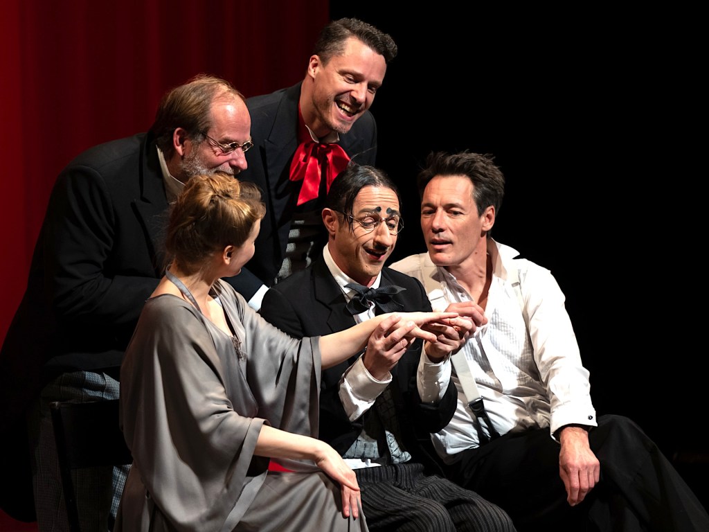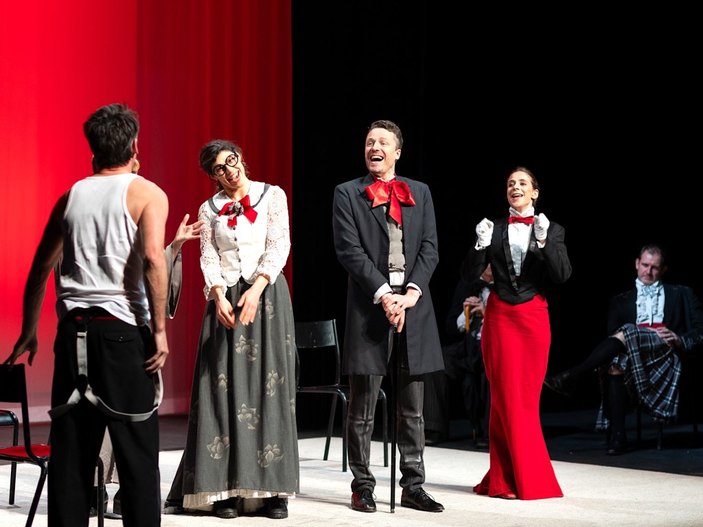 Anthony Magnier, formé à la commedia dell’arte auprès du maître italien Carlo Boso, fondateur de la Compagnie Viva et metteur en scène de ce spectacle depuis sa création en 2014 – plus de deux cent soixante-dix représentations au compteur – a pris le parti le plus audacieux et le plus judicieux qui soit : ne rien aplatir, ne rien assagir, mais amplifier jusqu’à l’absurde la logique interne de chaque scène. Sa mise en scène est un tour de force. Les portes qui claquent chez Feydeau, il les remplace par le corps même des comédiens : ce sont eux qui créent les obstacles, les espaces, les ruptures de rythme ; les coups de sonnette sont suggérés virtuellement par leur jeu. Les accessoires deviennent des partenaires à part entière. L’espace scénique, dépouillé mais précis, se transforme en terrain de jeu où chaque déplacement est millimétré avec la rigueur d’un mécanisme d’horlogerie ; c’est cette rigueur invisible qui produit le chaos le plus réjouissant, porté par un rythme endiablé maintenu durant tout le spectacle. La scène de la cage d’escalier, où les personnages se retrouvent coincés dans des situations de plus en plus embarrassantes, atteint des sommets grâce à cette mécanique infernale parfaitement maîtrisée. Anthony Magnier signe une mise en scène qui fait voler en éclats la poussière d’un vaudeville trop longtemps enfermé dans ses conventions et ses décors surchargés et en libère toute la folie contenue.