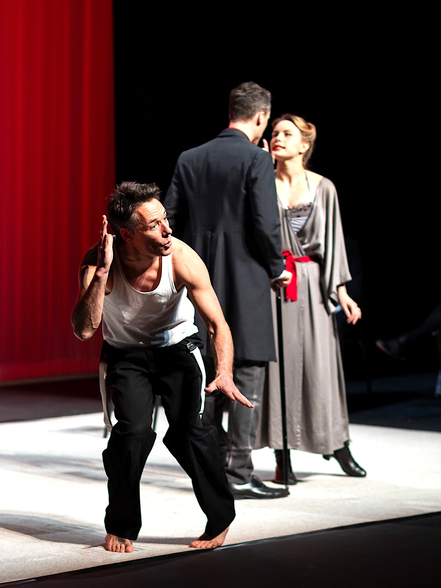 Arnaud Ducret, dans son costume blanc immaculé, incarne ce bourgeois aux certitudes ébranlées avec une vigueur physique impressionnante. Sa stature athlétique et son jeu tout en débordements lui permettent de camper un homme progressivement englouti par la panique, passant de l’arrogance tranquille à l’hystérie totale. Le comédien mobilise une présence scénique considérable, transformant son personnage en véritable tornade humaine face à l’injustice qui le frappe. Cette première vraie expérience théâtrale professionnelle révèle chez lui une aptitude certaine à tenir le plateau et à endosser la charge émotionnelle d’un rôle qui exige une montée crescendo vers la folie.