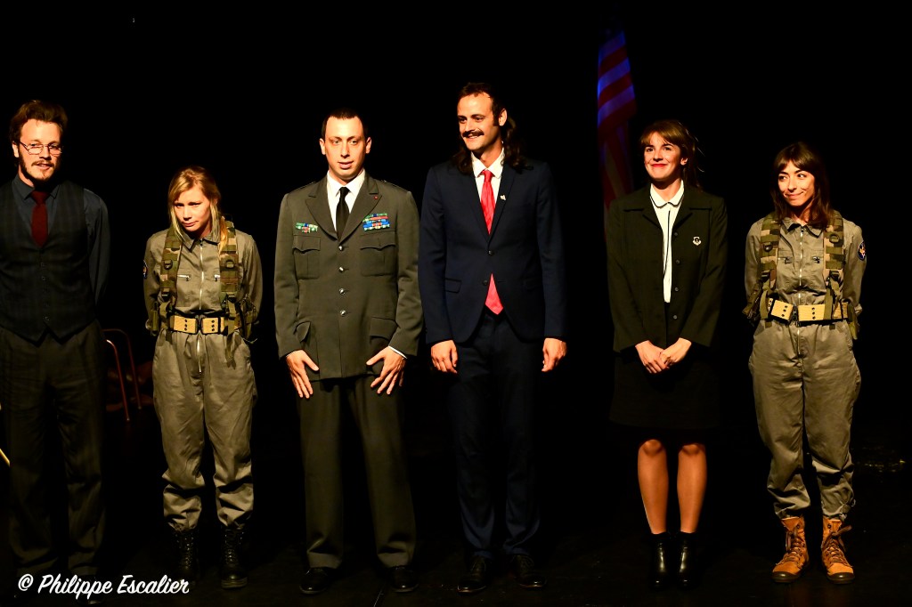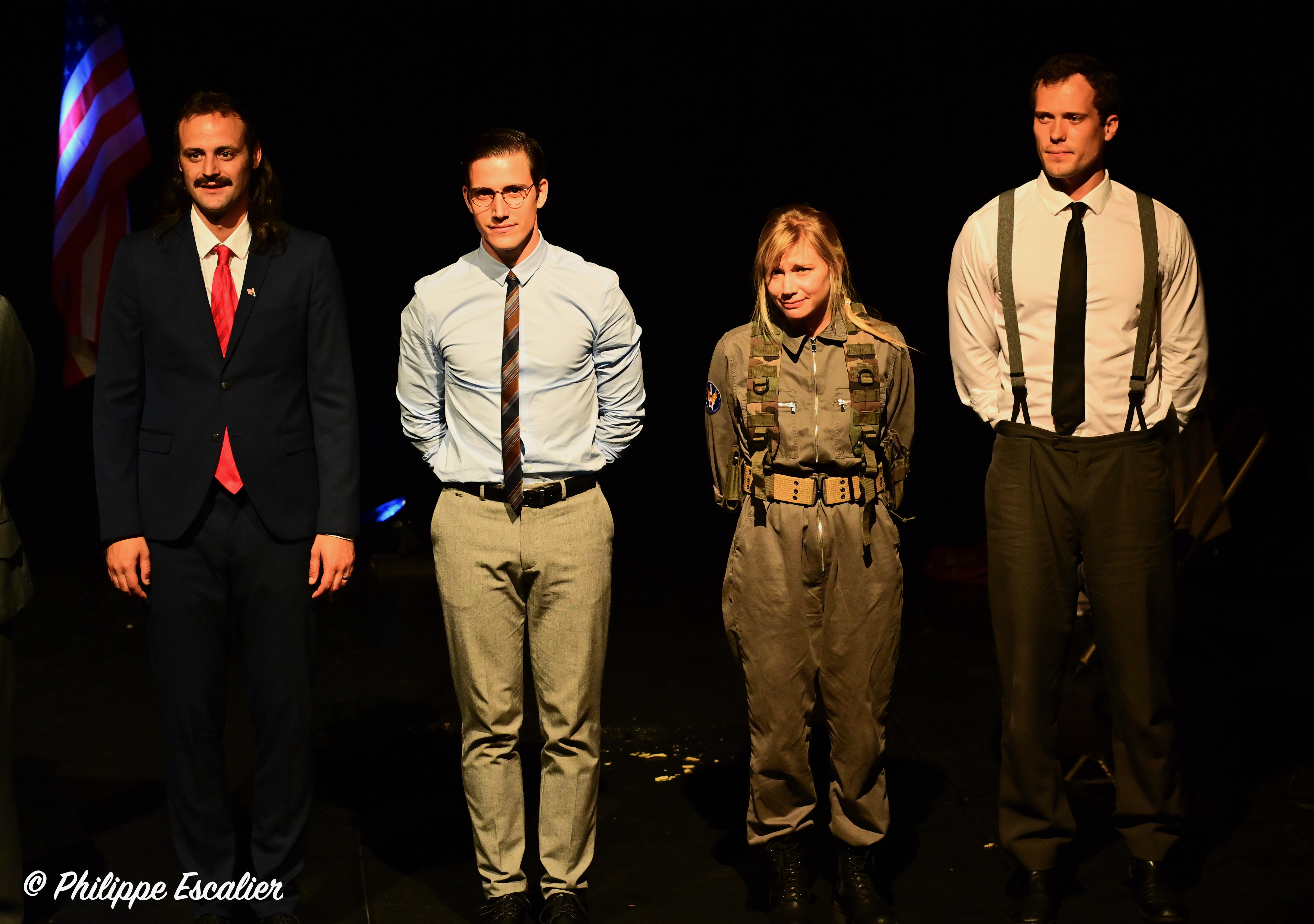 Basé sur l’intrigue de « Point limite », film de Sidney Lumet de 1964, mais aussi de « Docteur Folamour » de Stanley Kubrick, sorti la même année, « No Limit » n’hésite pas à s’affirmer comme un pot-pourri des comiques favoris de Robin Goupil, qui sont aussi les nôtres. Situations ubuesques, comique de répétition, dans cette comédie, l’on a peur ni des pitreries, ni du burlesque, ni du grotesque encore moins de l’absurde et du non-sens. Il se trouve que l’ensemble qui aurait pu vite devenir indigeste fonctionne bien et s’avère étonnamment léger. Indépendamment du « À la manière de » ouvertement revendiqué, qui pourrait faire dire « rien de nouveau sous le soleil », la mécanique et la construction subtile du spectacle sont telles que l’on ne résiste pas longtemps à ce bombardement de gags auquel il convient de tirer son chapeau. D’autant que cette belle architecture diablement efficace trouve son répondant dans la qualité de la troupe, mise en scène par l’auteur. Thomas Gendronneau, Victoire Goupil, Martin Karmann, Théo Kerfridin, Maika Louakairim, Augustin Passard, Stanislas Perrin, Laurène Thomas, Tom Wozniczka sont parfaits, dans des rôles pourtant tout sauf évident. Ensembles, ils contribuent à rendre cette « Etoffe des zéros » si l’on peut oser ce détournement, parfaitement délicieuse.