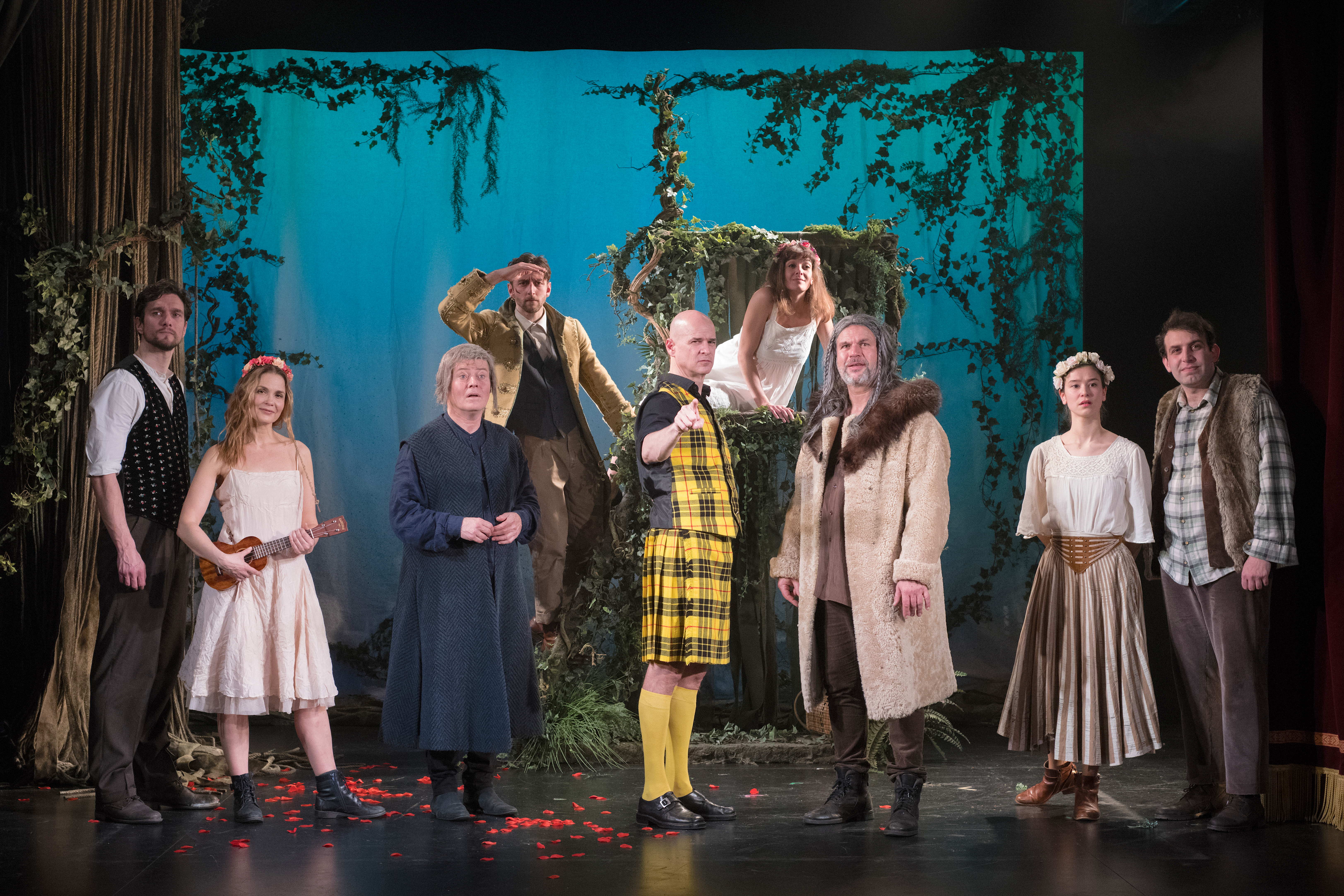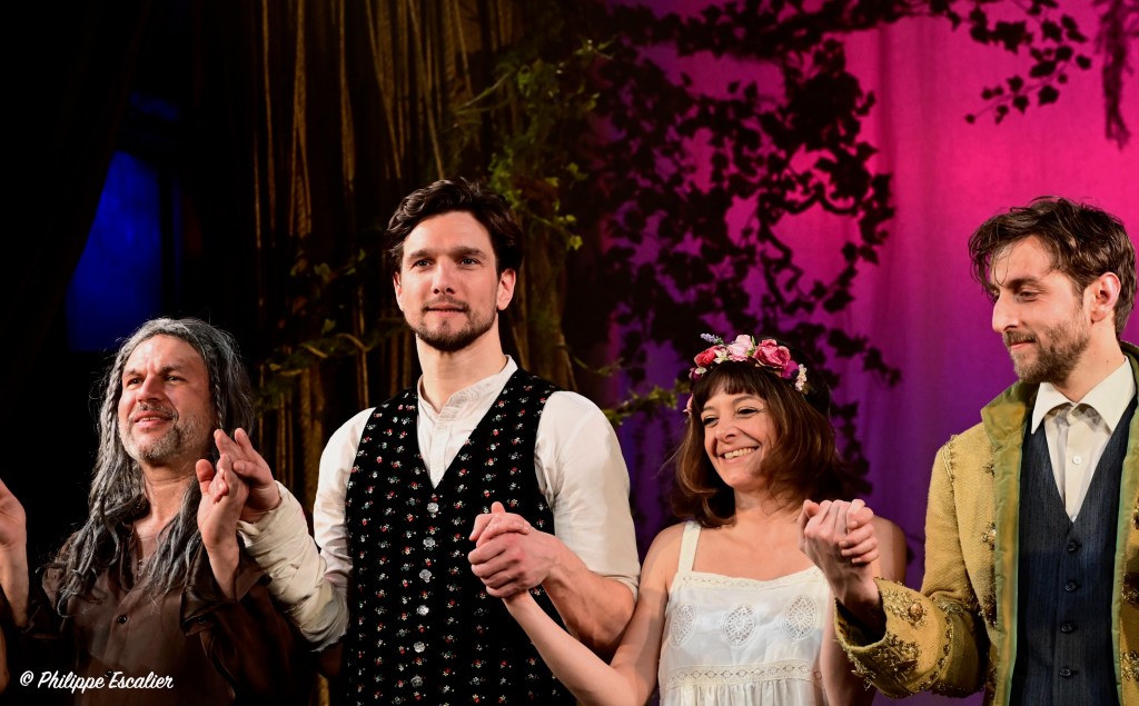 À la Pépinière, de toute évidence, avec « Comme il vous plaira », les ingrédients propres à ravir un public exigeant sont réunis. Un texte jubilatoire pour commencer, parfaitement ciselé et rendu plus pétillant encore par l’adaptation lumineuse et légère de Pierre-Alain Leleu faisant ressortir les subtilités incomparables de cette langue toujours si richement imagée et porteuse d’un irrésistible humour. La mise en scène ensuite permet d’en faire un petit bijou. L’une des options consiste à occuper tout l’espace disponible, y compris la salle, autorisant les comédiens à se déplacer et à faire corps avec le public. Ces nombreux mouvements, toujours très maîtrisés, donnent une énergie particulière au spectacle. Léna Bréban fait ensuite feu de tous bois. Son décor, simple et pratique, parfaitement suggestif, permet de revivre aisément chaque situation. La musique (en live) est utilisée en guise de ponctuation festive, accroissant ainsi le ravissement du public heureux d’entendre quelques tubes pop des années 70 venus souligner, avec un vrai sens de la dérision, le côté féérique et délicieusement improbable du récit. Tel est l’écrin dans lequel la troupe donne libre court à son talent. Barbara Schulz, qu’elle soit princesse (Rosalinde) ou travestie en homme pour les besoins de sa fuite, est d’une énergie et d’une grâce peu communes, jouant l’amoureuse transie, hypnotisée par le charme envoutant d’un nobliau prenant les traits de Lionel Erdogan. Le jeune acteur fait tant et si bien qu’additionnant toutes les qualités, il séduit la princesse par son allure et le public par son jeu (l’inverse est vrai aussi !). Pour compléter ce joyeux duo, il fallait tout le talent d’Ariane Mourier qui donne à l’autre princesse (Célia) une éclatante présence. Adrien Dewitte est radieux, sans défaut, aussi convaincant en frère jaloux prêt à tout qu’en repenti sincère que les leçons de la vie ont transformé. Jean-Paul Bordes alterne, selon les moments, le duc impitoyable et le serviteur fidèle en fin de vie, (fort bien grimé), aussi percutant dans chacun de ses deux rôles. Pierre-Alain Leleu joue un Jacques assez extravagant, voyageur mélancolique, personnage récurrent chez Shakespeare venu notamment nous offrir la fameuse réplique « Le monde entier est un théâtre, et tous, hommes et femmes, n’en sont que les acteurs ». Éric Bougnon en duc exilé, tombé du bon côté de la force, Léa Lopez et Adrien Urso (en paysans ayant du mal à s’accorder) sont à l’unisson. Cette merveilleuse équipe qui ne manquera pas de vous plaire vous offre deux heures de plaisir rare que vous ne verrez pas passer !