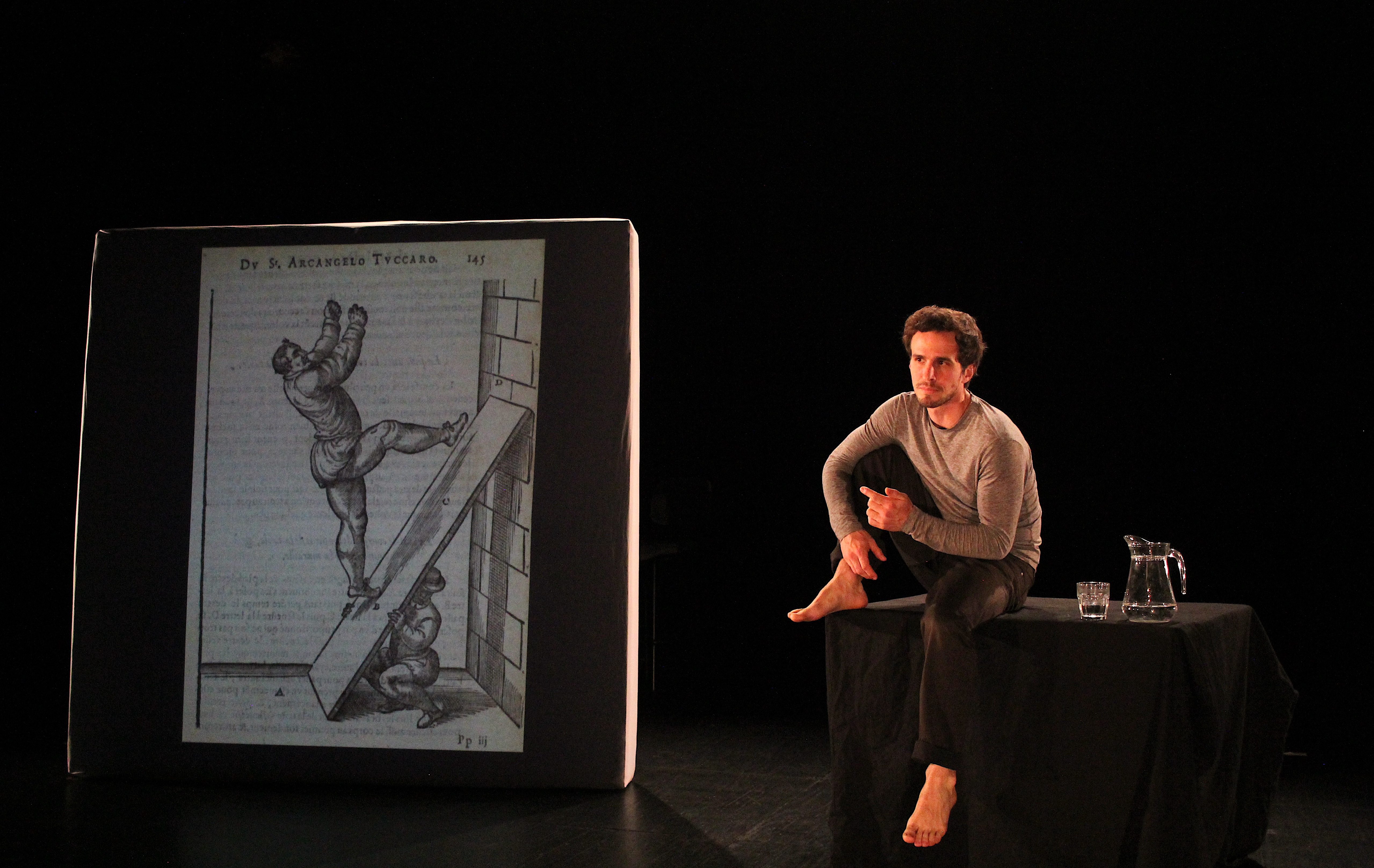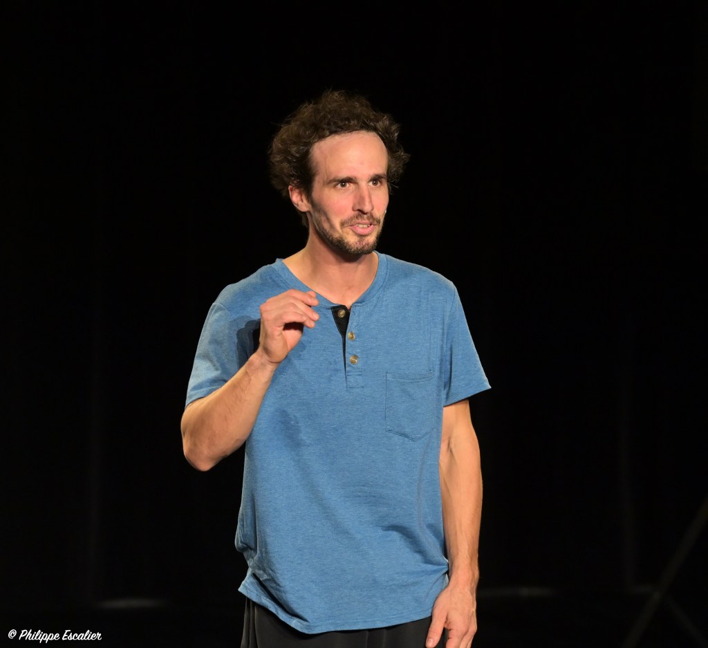 Tout commence par un visuel s’offrant au regard des spectateurs et leur enjoignant de ne surtout pas tenter de reproduire ce qu’ils vont voir. En attendant que les rangées se remplissent complétement, l’artiste est là, en tee-shirt et pantalon de survêtement, qui arpente la salle. Puis il commence. Il décrit les différents sauts périlleux possibles, raconte avec humour comment, prudent, il a toujours évité les figures pouvant le mettre en péril et de quelle manière son art lui servait de monnaie d’échange dans les bars que tout jeune il fréquentait : un saut contre une pinte ! Le plus recherché et le plus récompensé étant le saut périlleux raté ! On le suit dans son évocation de ses ancêtres acrobates et des diverses figures techniques qui caractérisent sa discipline, on rit à l’évocation de son étrange découverte faite dans une église romane aux conséquences surprenantes. Et nous ne sommes pas au bout de nos surprises. Les soixante-quinze minutes que nous passons avec lui sont palpitantes et rarement la proximité avec un comédien aura été si grande. L’artiste se paie même le luxe de nous parler de Descartes (le passage est croustillant) ou encore des corps comme expression physique de la lutte des classes. Matthieu Gary, avec un incontestable talent de conteur, aborde des sujets très différents, tous liés à cet art auquel il a consacré sa vie. Si ce n’est les rires qui fusent ou les facéties auxquelles il se livre, l’on pourrait se croire revenu sur les bancs de l’école, suspendu aux lèvres d’un enseignant passionnant dont on ne voudrait rater le cours pour rien au monde. « Faire un tour sur soi-même » nous démontre à quel point la passion peut être contagieuse. C’est dire à quel point faire un tour au Rond-Point est la priorité absolue de cette fin de semaine.