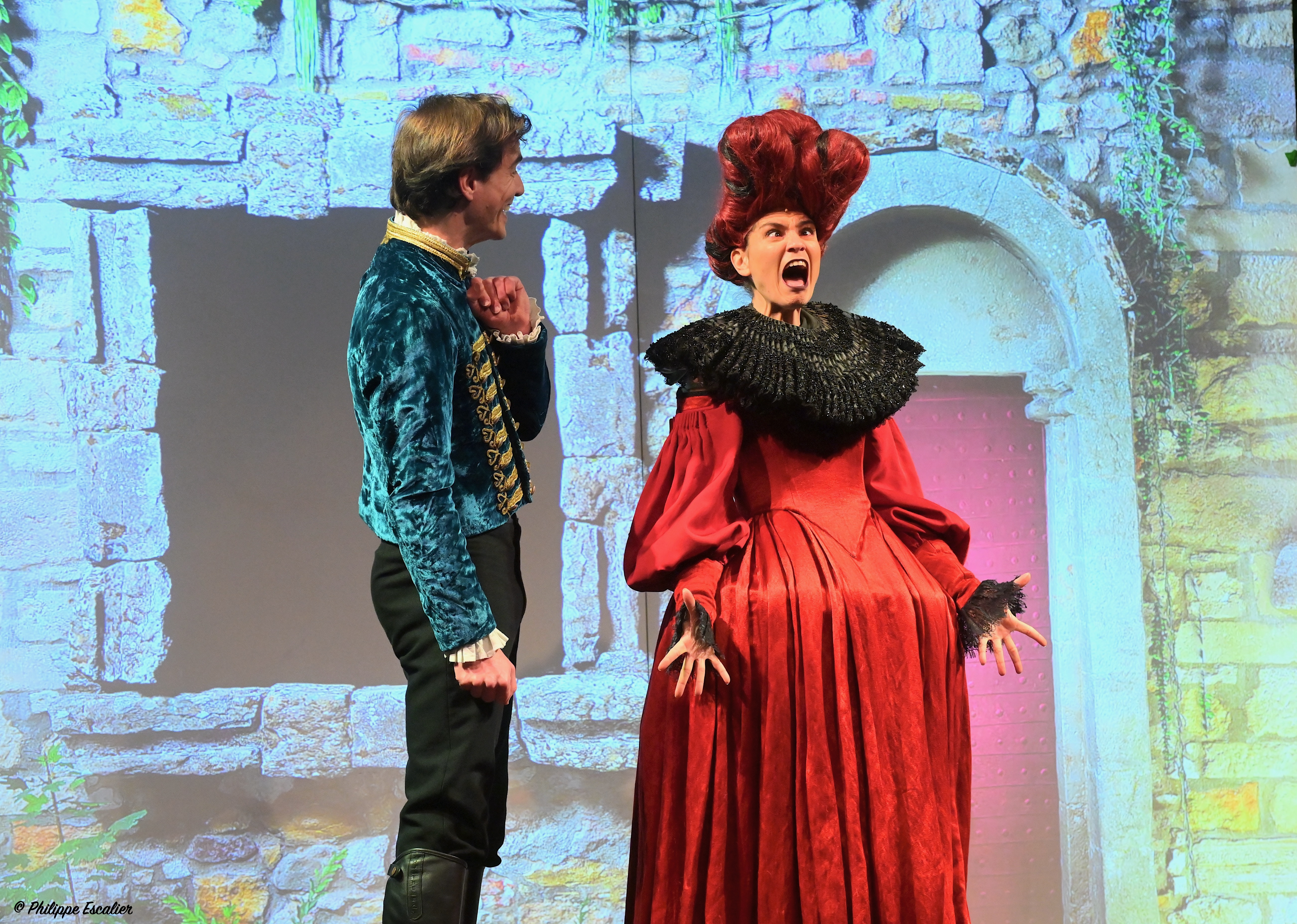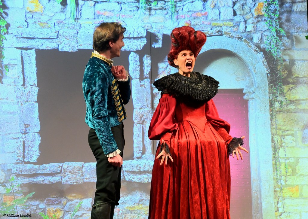 Faire un spectacle très visuel, avec les moyens que nous donne la technologie aujourd’hui, mais sans en abuser, avec une écriture tonique, pleine d’humour, truffée de références (notamment à la chanson) et d’anachronismes hilarants, le tout porté par une excellente troupe, telle est la recette qui a permis à Olivier Solivérès d’être plébiscité par le public et par deux fois nommé aux Molières pour « Le Bossu de Notre-Dame » et « Blanche-Neige ». D’entrée, le ton est donné et avant l’ouverture du rideau, les enfants sont appelés à réagir (ils le feront d’ailleurs abondamment, tout au cours du spectacle) face à une reine qui n’est pas encore apparu mais qui manifeste déjà son cruel despotisme. La résistance s’organise dans la salle qui prend naturellement le parti de la malheureuse princesse et de son vaillant Prince Charmant en leur apportant un constant soutien très sonore.