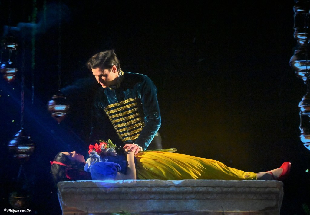Le jeu remarquable des comédiens est indispensable pour capter l’attention des enfants et s’assurer de leur participation. Le résultat dépasse les attentes. Marion Belham une magnifique et exubérante reine. Il est bien difficile de résister à ses effets comiques qu’elle partage avec son valet Victor, l’irrésistible et bouillonnant Thomas Langlet. Clara Hesse qui fait d’excellents début dans le rôle-titre, est parfaite en princesse martyrisée avant de s’épanouir en compagnie des sept mineurs lui offrant l’hospitalité. Le sort tragique que la jalouse et narcissique reine lui réservait sera heureusement contrarié par l’amour du jeune prince auquel Hadrian Levêque Di Savona apporte toutes ses qualités de chanteur et d’acteur, à quoi il faut ajouter une belle prestance (son duo de début avec la reine qui voudrait bien en faire son quatre heure est assez piquant). Cette belle distribution ne serait pas complète sans la présence de Alice Fleurey et Léa Grignon très efficaces sous les costumes et masques de nains.