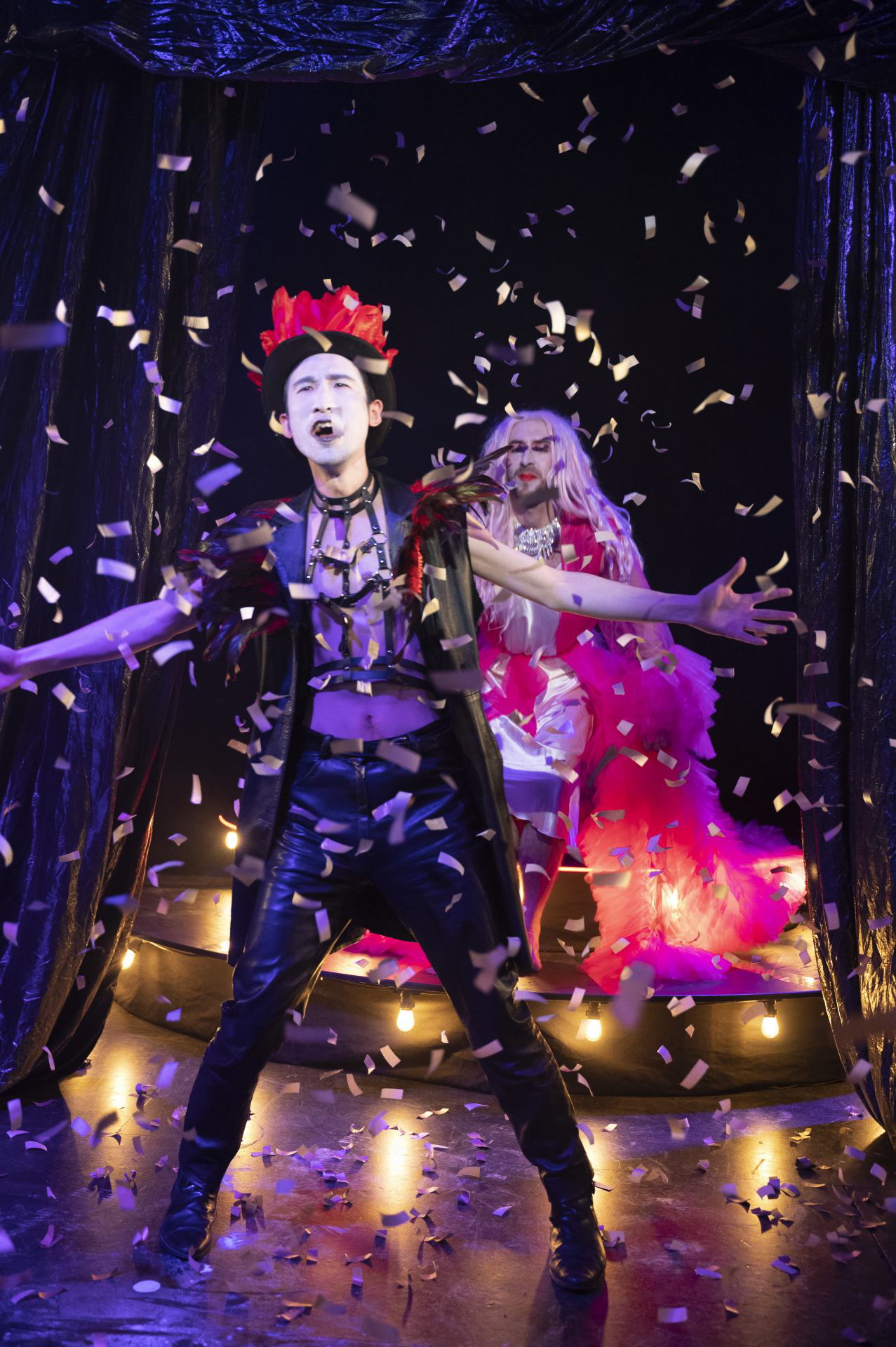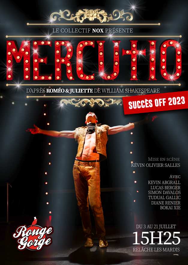 C’est à l’issue des cours Florent où les comédiens de la troupe se sont rencontrés (en cours du soir de deuxième année) que Kevin Olivier Salles leur propose cette création qui lui trottait dans la tête et lui tenait à cœur : « J’attendais de trouver des gens assez fous pour me suivre dans ce projet ». Se focaliser sur l’envers du décor de « Roméo et Juliette » à travers le personnage de Mercutio, dans une folle ambiance de cabaret, tel était le pari de départ. Le travail d’adaptation se fait à partir de la traduction de Jean-Paul Jouve et sur la base d’une écriture de plateau qui permet de mixer adroitement le texte de Shakespeare avec des apports d’une tonalité moderne et jeune correspondant parfaitement à l’œuvre. À quoi s’ajoutent des parties musicales importantes en live, dont Kevin Abgrall (l’interprète de Benvolio) est en grande partie l’auteur. S’y ajoute du chant et de la danse contribuant à nourrir un univers décalé, onirique et burlesque, teinté de fantaisie. Ce petit bijou vient de trouver son écrin dans l’espace l’atypique du Rouge-Gorge avec ses 200 places et sa structure très « cabaret » sur plusieurs niveaux.