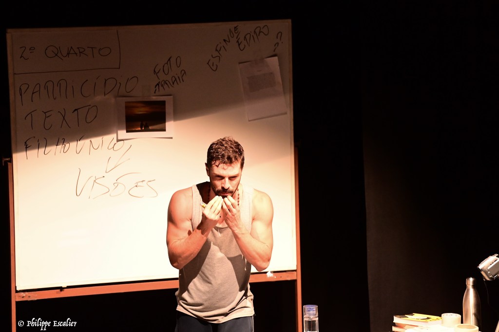 Tout a commencé avec mes cours de théâtre à l’université à Rio, puis, dans la foulée, en 2016, la création de ma propre compagnie, REG’s Produções Artística. En 2017, je suis tombé sur « Tebas land » avec le metteur en scène Victor Garcia Peralta. Pour nous, ce fut comme un coup de foudre. L’œuvre, écrite en espagnol, était très dense et demandait plusieurs heures de jeu. Nous l’avons adaptée en brésilien et l’auteur, Sergio Blanco, a été merveilleux, il nous a fait confiance et nous a autorisé à faire ce que nous souhaitions. Les premières représentations ont eu lieu en 2018 à Rio.