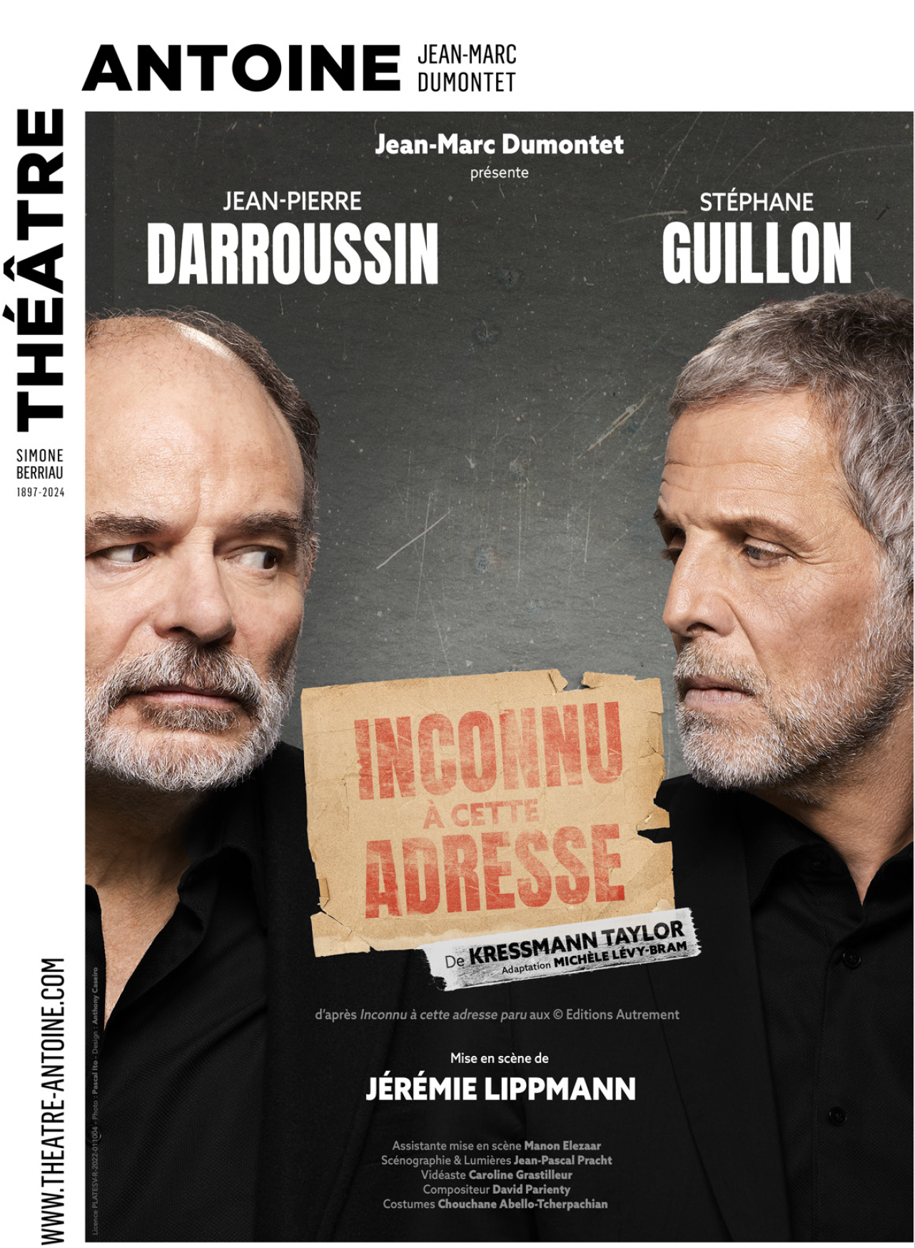 La célèbre pièce de Kressmann Taylor avec Jean-Pierre Darroussin et Stéphane Guillon savamment mis en scène par Jérémie Lippmann, nous offre un remarquable et intense moment de théâtre.
