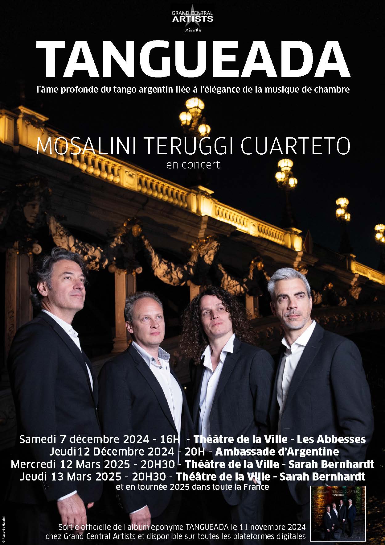Après avoir ébloui le Théâtre des Abbesses en décembre 2024 et avant de partir en tournée, le Mosalini-Teruggi Cuarteto vient fêter ses dix ans d’existence en présentant « Tangueada » leur 3eme et tout nouvel album à Paris. On ne pouvait rêver plus bel anniversaire !