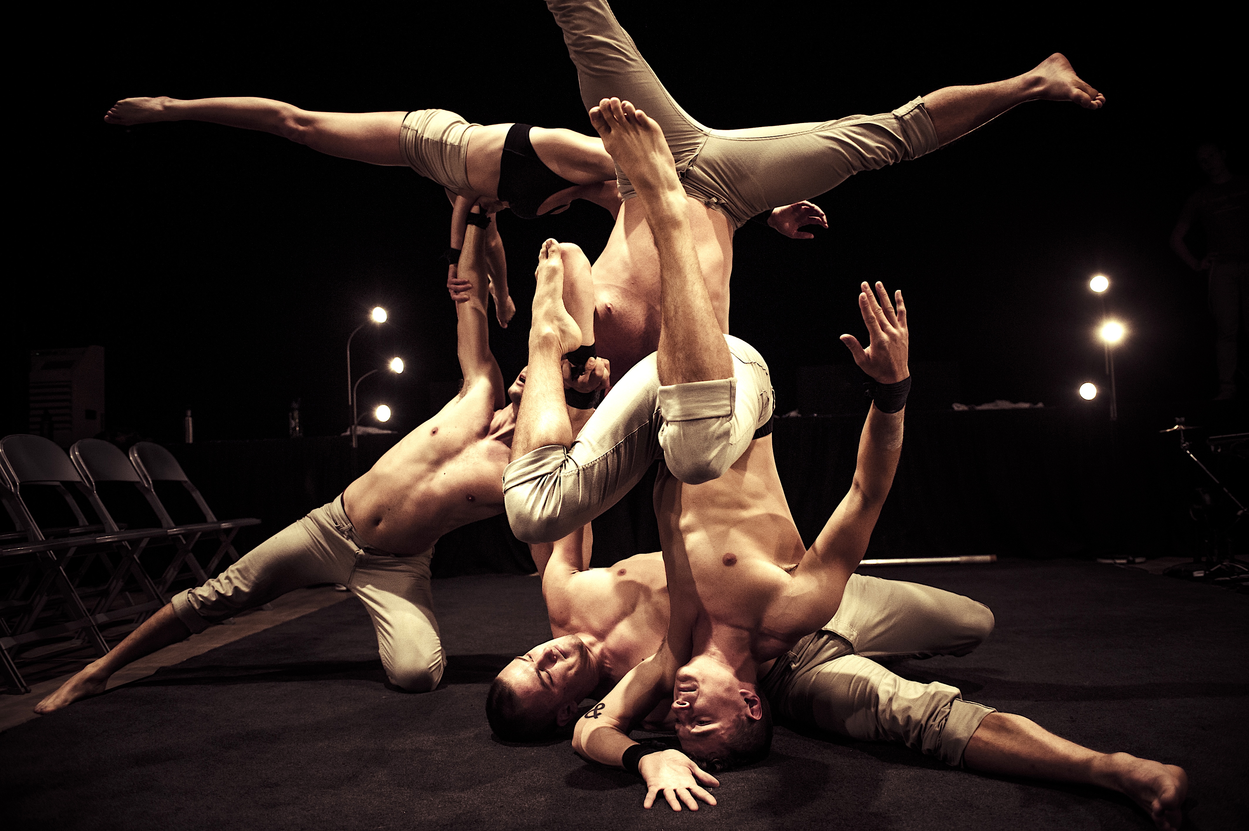 Le titre dit tout, ou presque. Un espace simple : un plateau nu, deux petites colonnes de lumières blanches qui délimitent l’aire de jeu, et rien d’autre, sinon les sièges des spectateurs qui vont pouvoir assister au spectacle sur scène. Pas de décor, pas de maquillage, pas de machinerie dissimulée dans les cintres. Ce dépouillement radical n’est pas une contrainte budgétaire mais un parti pris esthétique d’une cohérence absolue. Ce que la compagnie affiche ainsi, c’est sa confiance totale dans le corps humain comme matière première et instrument du spectacle. La scénographie, si l’on peut appeler ainsi cette absence revendiquée, oblige le regard à se concentrer sur l’essentiel : la chair, le souffle, l’équilibre et sa rupture. Michael Cook, seul musicien de la soirée, tient la pulsation de l’ensemble depuis son poste de percussionniste, guidant les enchaînements avec une précision et une énergie qui transforment la musique en colonne vertébrale invisible du spectacle. La composition d’Elliot Zoerner, mérite d’être saluée : elle sait accompagner l’effort avec toute l’énergie qui convient.