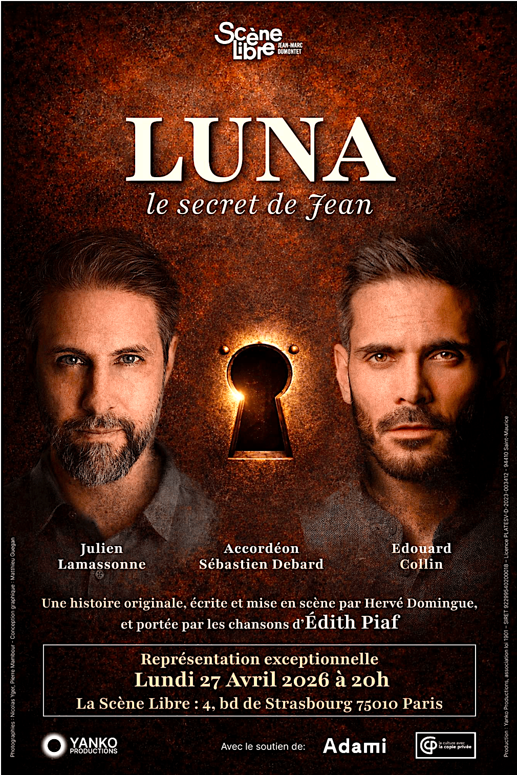 « Luna, le secret de Jean », histoire originale, texte et mise en scène d’Hervé Domingue. Avec Julien Lamassonne et Édouard Collin. Accordéon : Sébastien Debard. / La Scène Libre 4 bd de Strasbourg 75010 Paris. Représentation exceptionnelle lundi 27 avril 2026 à 20 h.